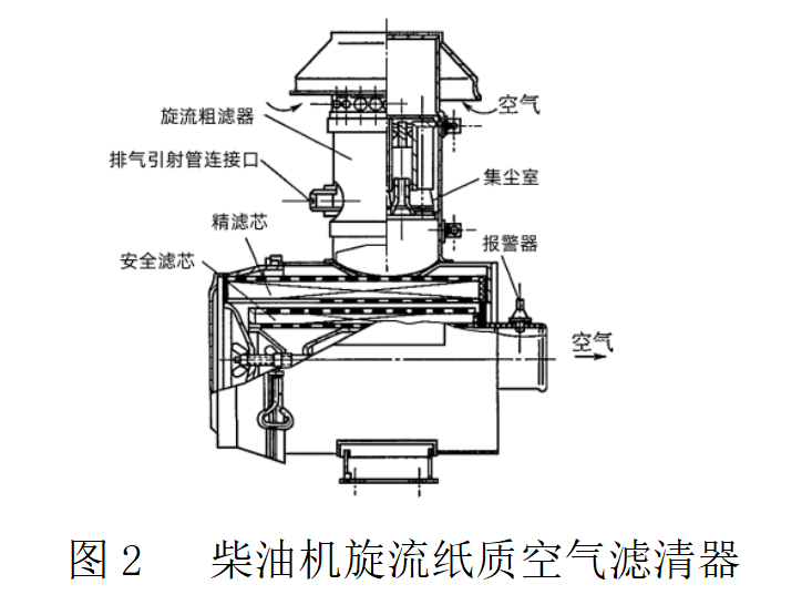 增壓柴油機用的旋流紙質(zhì)濾芯,它主要由旋流粗濾器(內(nèi)部豎置有旋流管)、紙質(zhì)主精濾芯和安全濾芯三部分組成,如圖2所示。空氣經(jīng)旋流管離心力的作用,使空氣中的絕大部分塵粒落入旋流管下端的集塵室,塵粒再經(jīng)排氣引射管隨柴油機廢氣一起排出。粗濾后較清潔的空氣通過紙質(zhì)精濾及安全濾芯濾清,最后進入發(fā)動機氣缸。