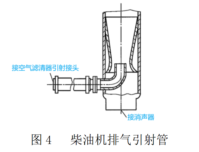 此外,需要注意的是當采用上述旋流紙質(zhì)空氣濾清器時,消聲器出口處需預(yù)裝有與之匹配的排氣引射管(安裝在消聲器出口處,如圖4所示)。當柴油機排氣時,高速氣流通過喉管處使廢氣氣流增大,于是便形成了真空度。利用此真空度將空氣濾清器集塵室中的塵粒經(jīng)橡膠管吸入排氣引射管內(nèi),并與柴油機廢氣一起排出。