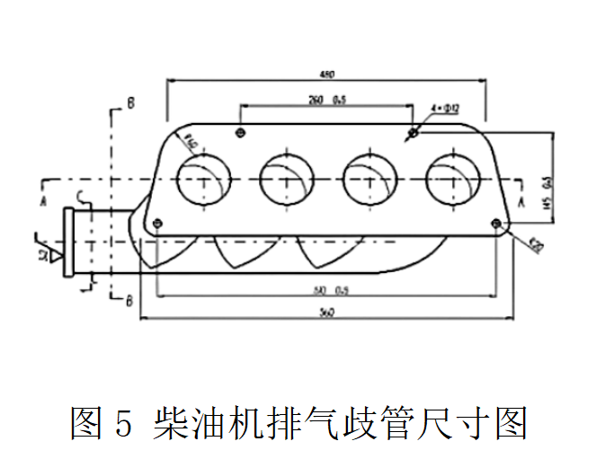 柴油機排氣管的作用是使廢氣從氣缸排出,結(jié)構(gòu)尺寸如圖5所示。排氣管應(yīng)具有較小的氣流阻力,以減小進氣和排氣阻力。現(xiàn)代柴油機還要求排氣管的結(jié)構(gòu)形狀有利于氣流的慣性與壓力脈動效應(yīng),以提高充量和排氣能量的利用率。