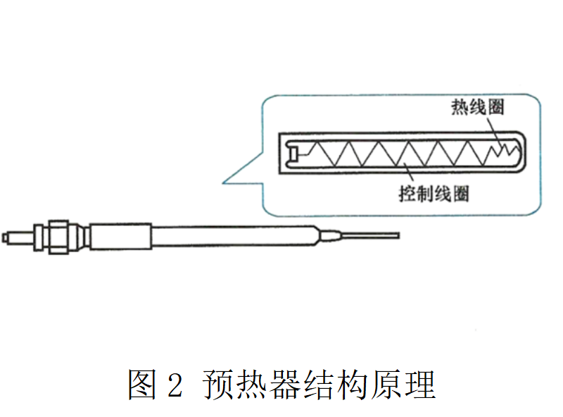 用于加熱燃燒室的空氣,如圖1所示;預熱器又稱為預熱塞,其結構原理如圖2所示。預熱器內裝有控制線圈,當其電阻隨著溫度的升高而增加時,可以減少流往與控制線圈串聯(lián)的熱線圈的電流量,使預熱器的溫度不會上升過高。預熱器的溫度可升至約900℃。