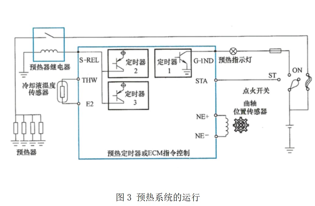 ② 當起動開關旋至ST時,預熱定時器或ECU指令控制將預熱器接通,防止預熱器溫度在起動時下降和改善起動性能。